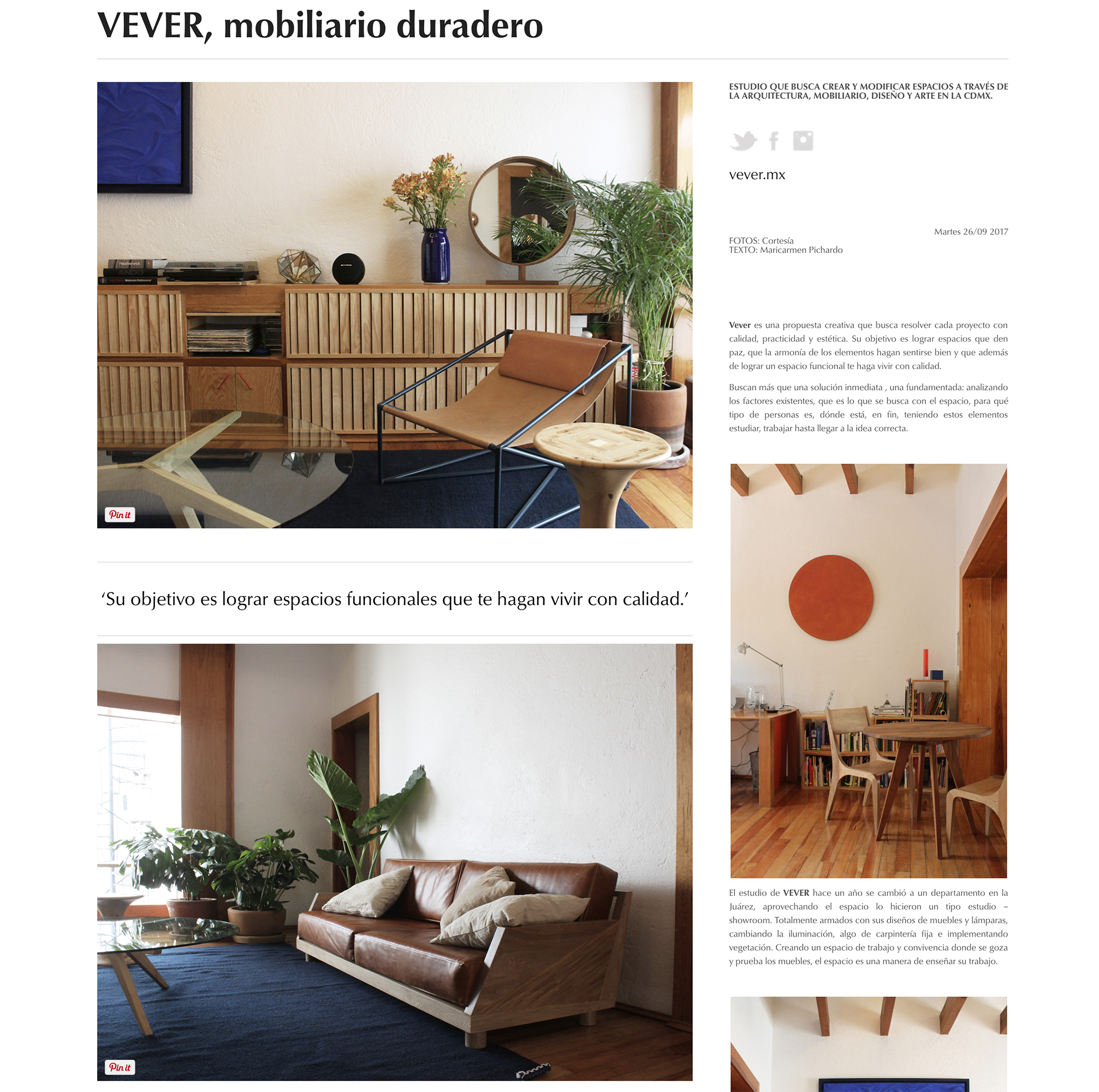 Articulo web sobre estudio VEVER, sus espacios y sus muebles.